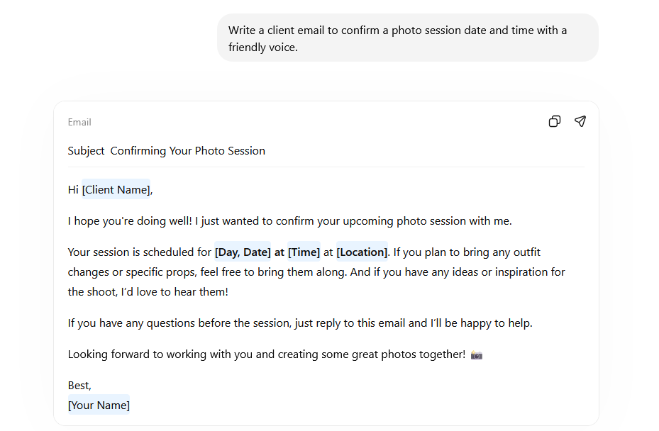 Here is what most photographers do when they discover AI tools are useful for writing: they start prompting. They type âwrite a session confirmation email for a pet photography clientâ and they get something back and they either use it, tweak it a little, and move on.